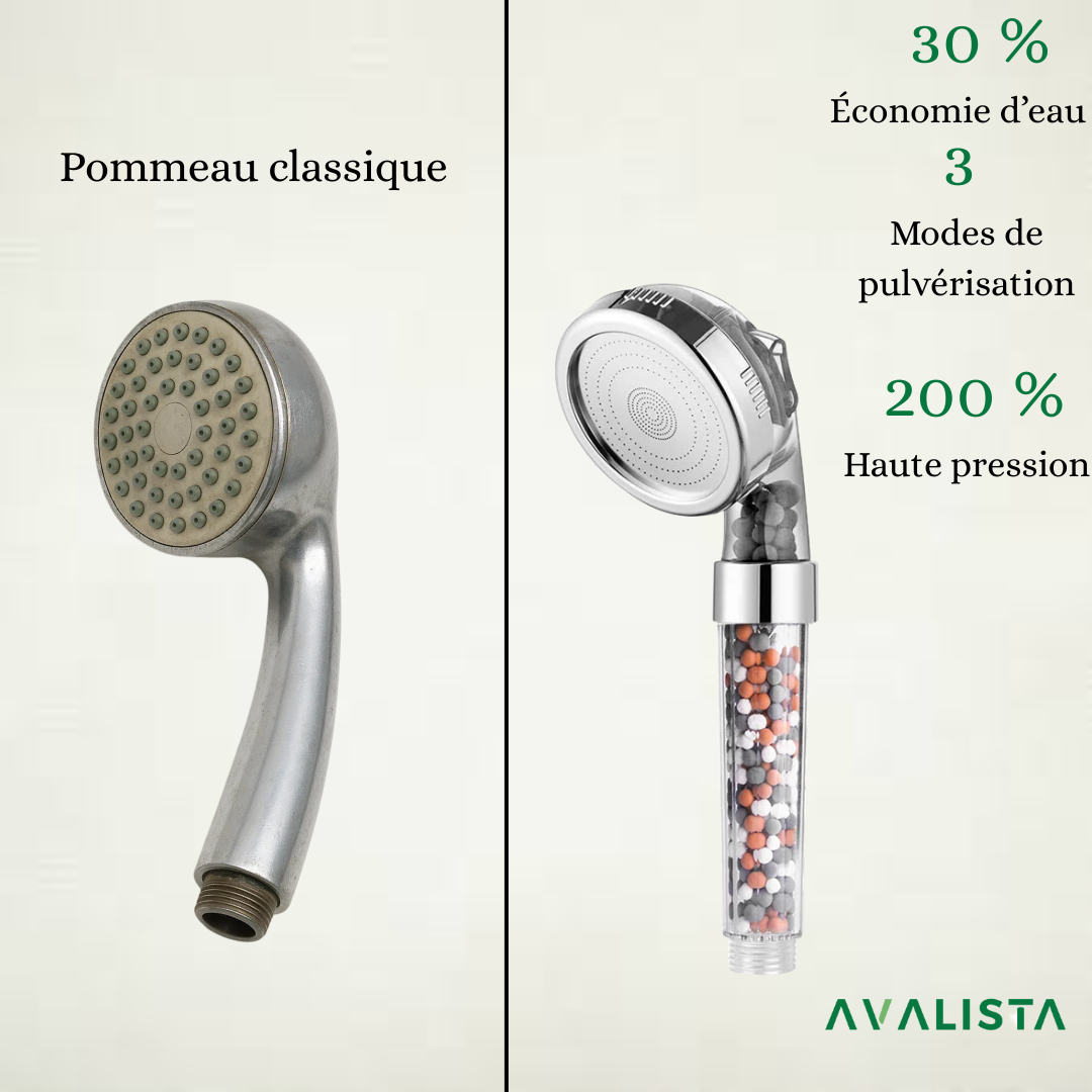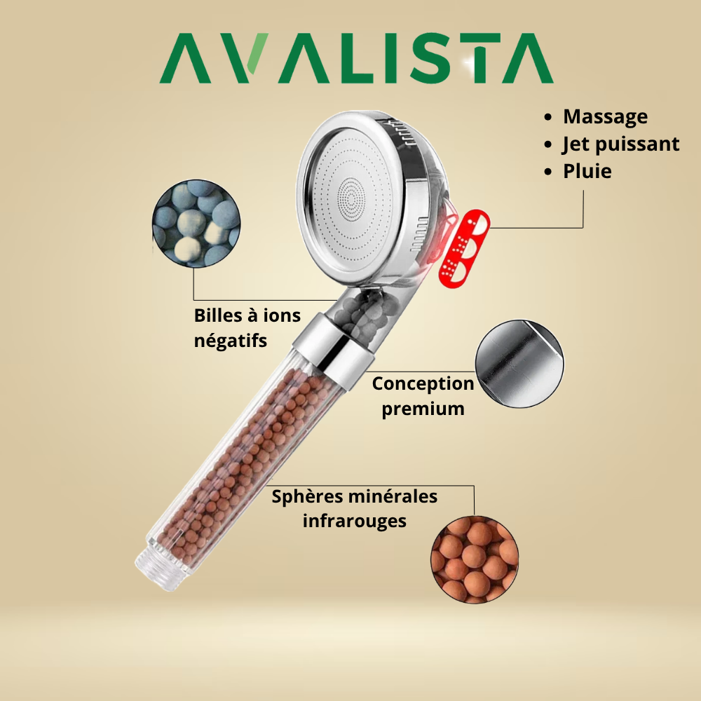 Les billes filtrantes contenues dans le pommeau Avalista sont composĂ©es de minĂ©raux naturels (tels que la tourmaline, le germanium ou lâargile cĂ©ramique). Elles agissent en purifiant lâeau : elles rĂ©duisent le chlore, filtrent les impuretĂ©s, neutralisent les mĂ©taux lourds et adoucissent lâeau calcaire. Cela rend lâeau plus douce pour la peau et les cheveux, tout en amĂ©liorant la sensation sous la douche.